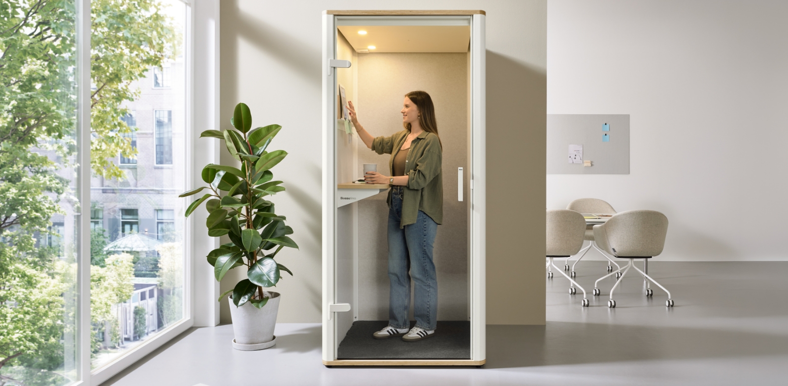 Mit dem Bosselino Uno bietet Bosse genau den Raum, der für diesen Me-Space gebraucht wird: Eine kompakte Telefonbox für das Büro, die akustisch abgeschirmt ist und dabei trotzdem offen für modernes Design bleibt. Hier können Mitarbeitende ungestört telefonieren, denken, planen oder einfach kurz durchatmen. Was den Bosselino so besonders macht: Er kombiniert hochwertige Materialien mit Funktionalität und einem ästhetischen Design. Die schalldämmende Konstruktion, die dimmbaren LEDs, die automatische Belüftung und die angenehme Raumakustik sorgen für eine Umgebung, in der man sofort zur Ruhe kommt. Und das ganz ohne sich vom Rest des Teams isoliert zu fühlen.